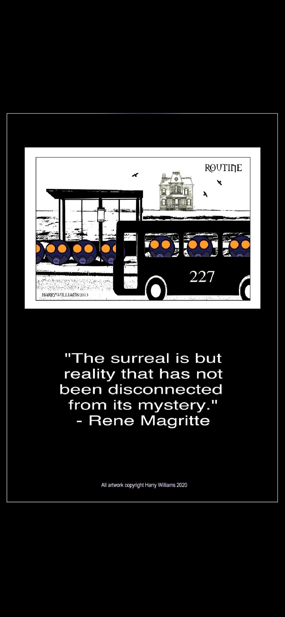 This artwork takes a normal bus stop scene and makes it look strange and dreamlike. The people all look the same, showing how everyday routines can feel dull or repetitive. The empty sky and lonely house add to the feeling that something is slightly off. It’s a reminder that even ordinary moments can have a mysterious side.