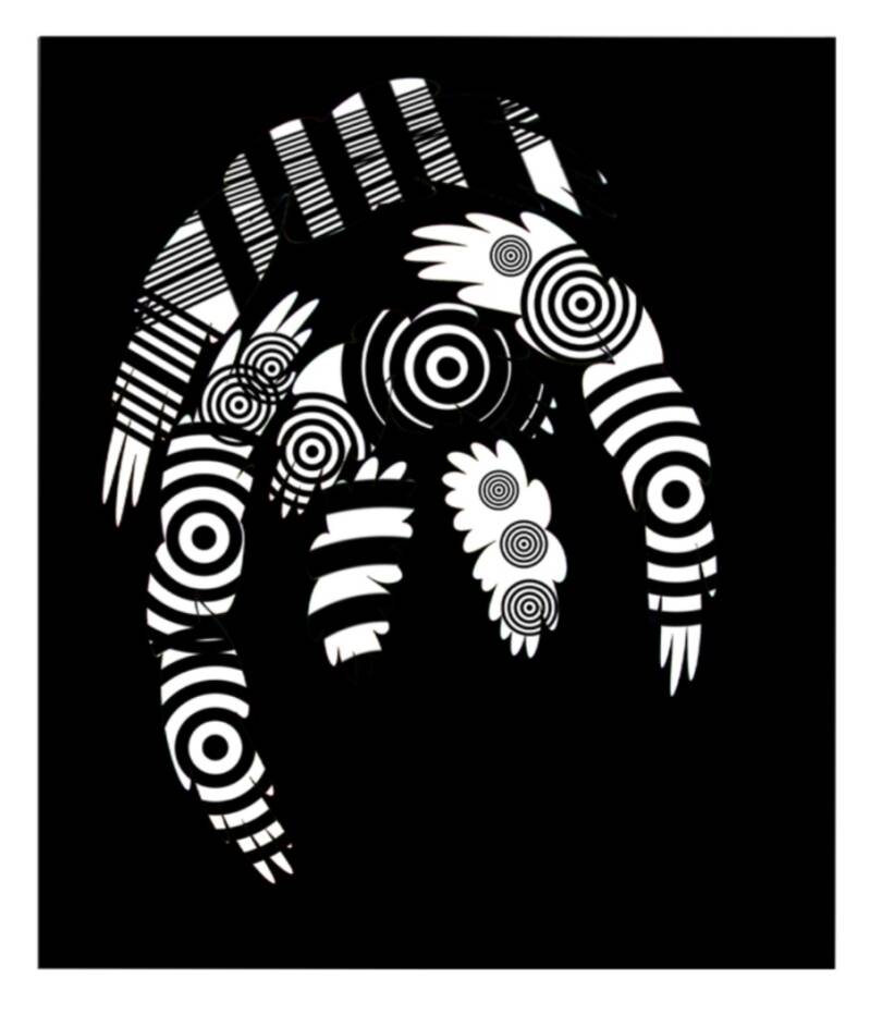 A crescent-shaped form emerges from a field of deep black, constructed entirely from high-contrast white motifs concentric circles, stripes, and feather-like extensions. The repeated circular targets function like eyes, sound waves, or psychic nodes, giving the piece a hypnotic, almost ritualistic presence. These circles pulse visually, creating movement without motion, as if the form is vibrating or alive.