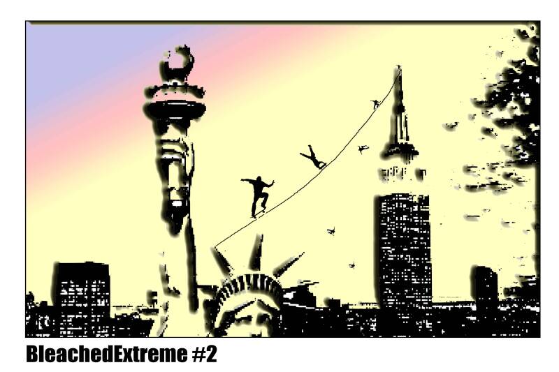 Famous shapes rise like ghosts, tall towers and a broken symbol of freedom, stripped of detail and colour.
